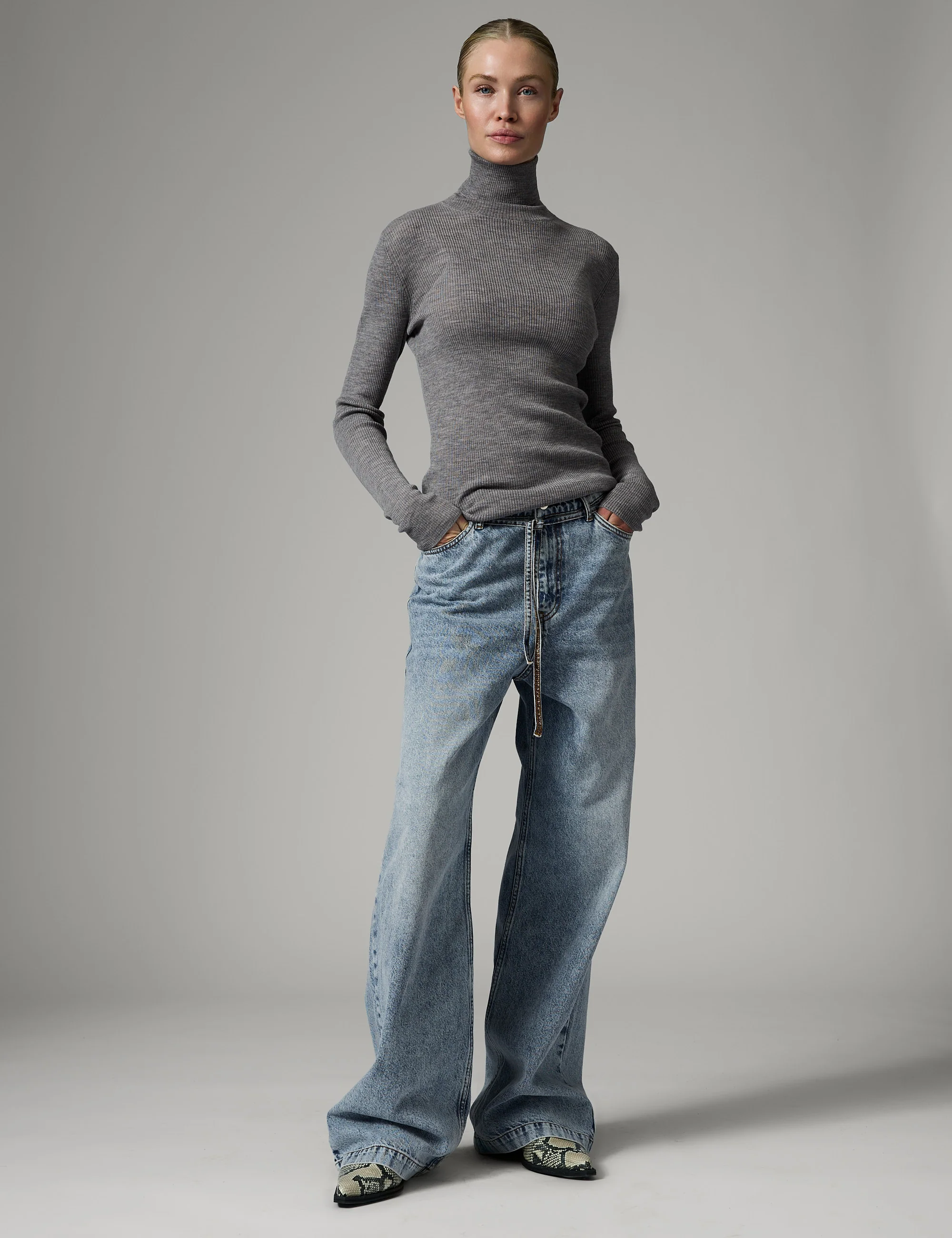 A roll neck, thin knit with a ribbed texture and stretchy feel. Wear under a V-neck dress for a modern layered look.